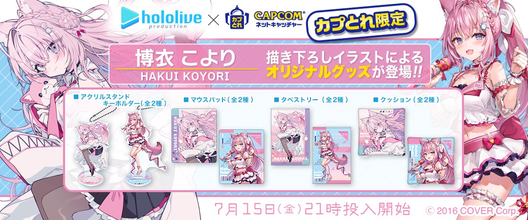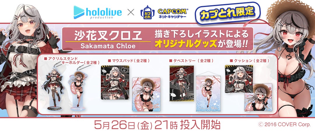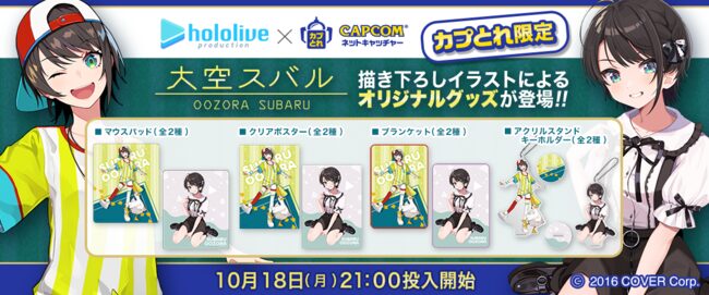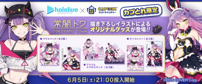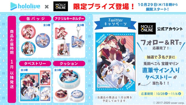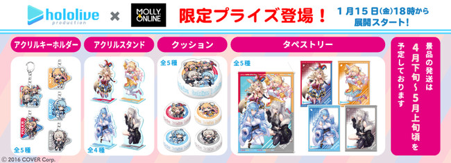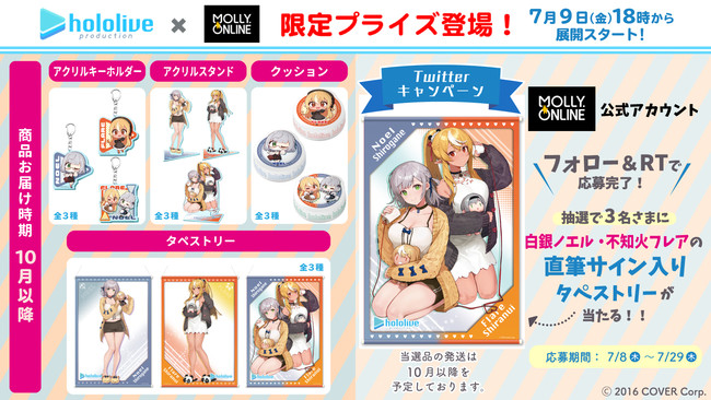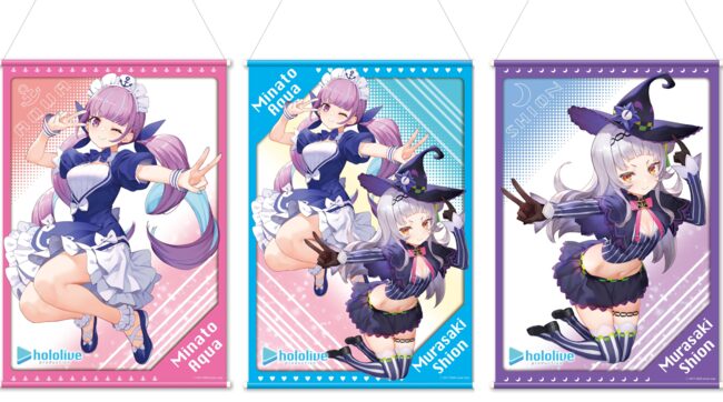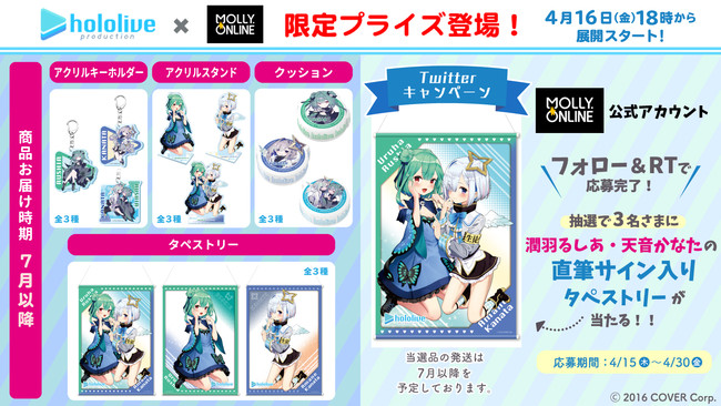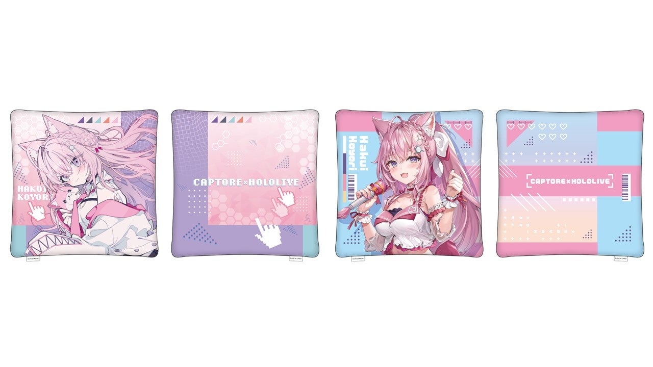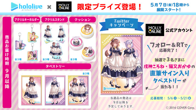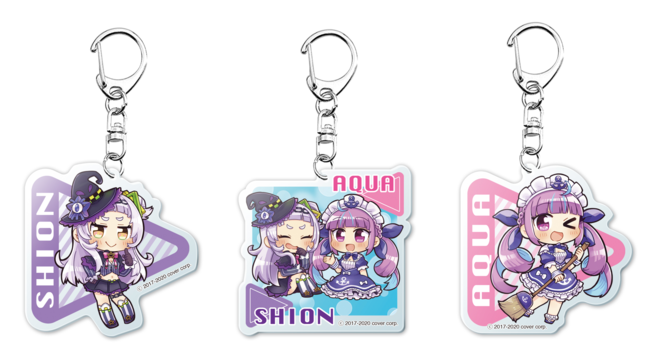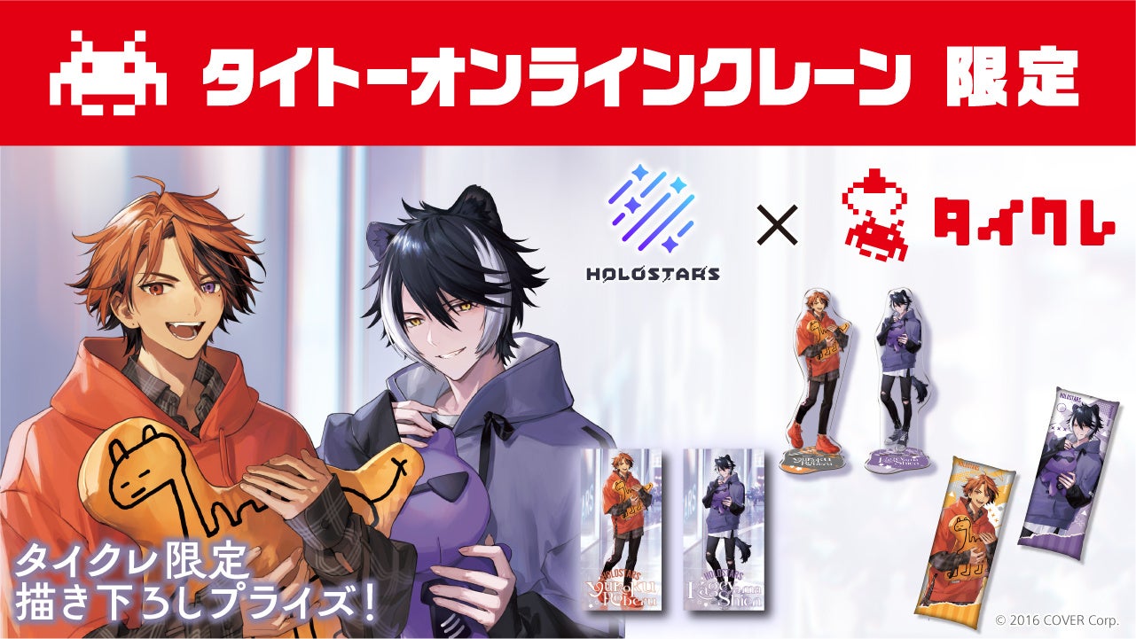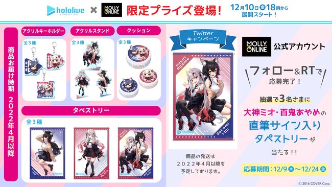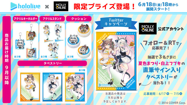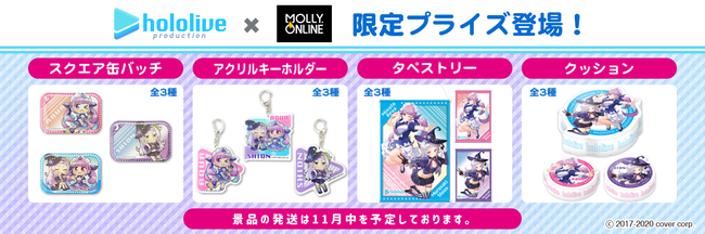 「ホロライブ」×「モーリーオンライン」コラボ第1弾として、女性VTuberグループ「ホロライブ」のタレント「湊あくあ」「紫咲シオン」を起用したモーリーオンライン限定プライズゲーム用景品を、2020年8月27日(木)18時より展開。クッション、タペストリーのイラストは弊社所属タレント「大神ミオ」のキャラクターデザインも担当した「泉彩(いずみ・さい)」さん、缶バッジ、アクリルキーホルダーのイラストは「さめあんこ」さんに描き下ろし。