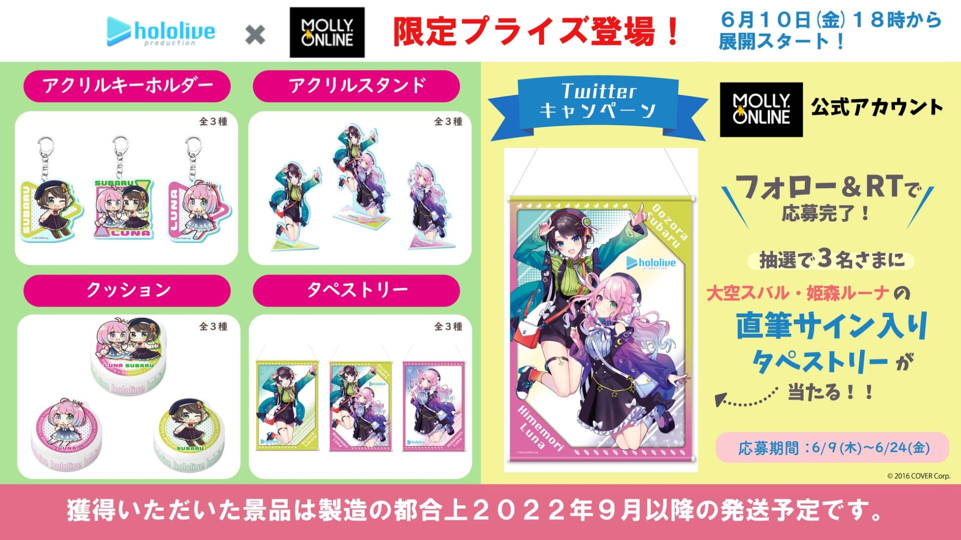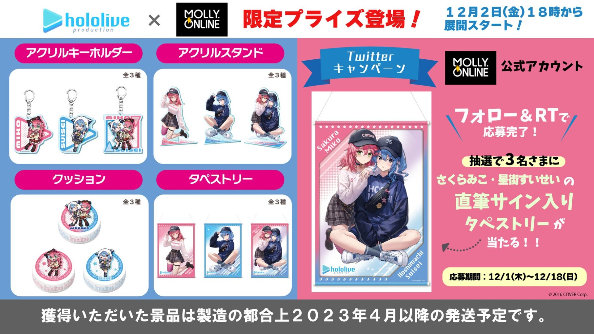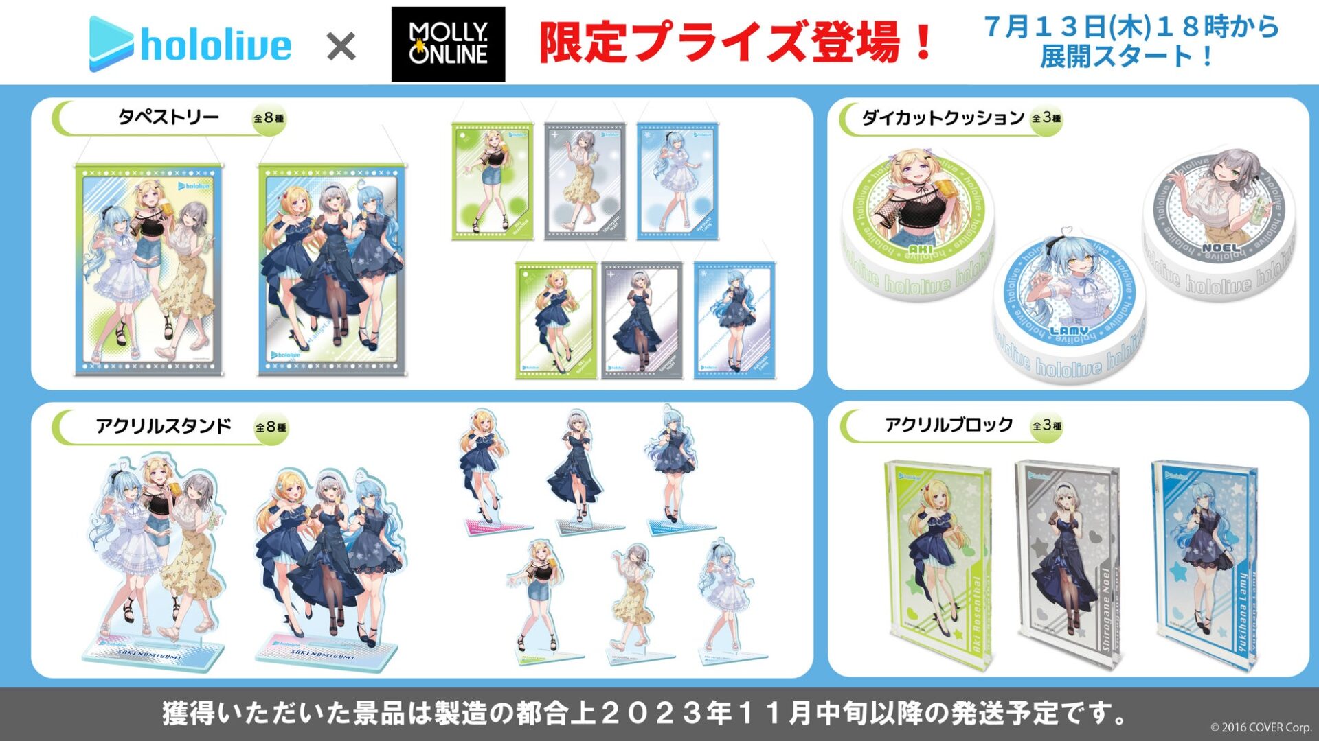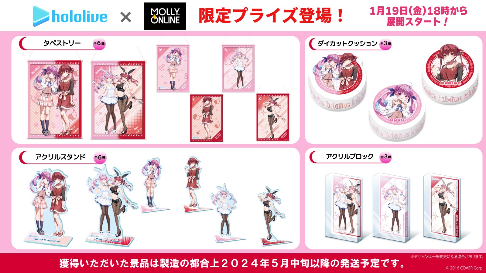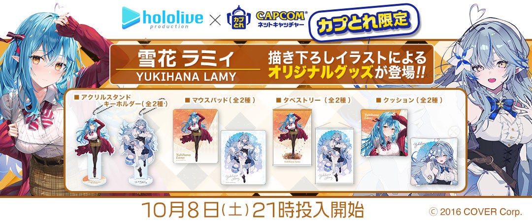 「ホロライブ」×「モーリーオンライン」コラボ第1弾として、女性VTuberグループ「ホロライブ」のタレント「湊あくあ」「紫咲シオン」を起用したモーリーオンライン限定プライズゲーム用景品を、2020年8月27日(木)18時より展開。クッション、タペストリーのイラストは弊社所属タレント「大神ミオ」のキャラクターデザインも担当した「泉彩(いずみ・さい)」さん、缶バッジ、アクリルキーホルダーのイラストは「さめあんこ」さんに描き下ろし。