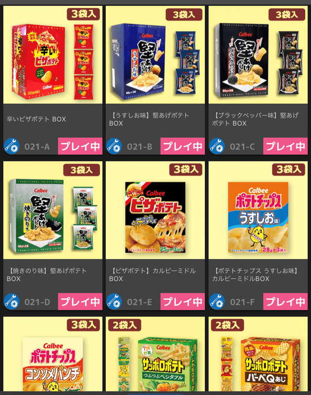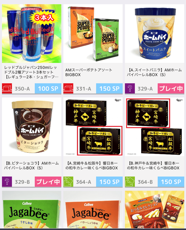 クラウドキャッチャーでは、ケース単位のお菓子や飲料が多くラインナップされている。ラインナップには多少波がある印象で景品数が少ない場合もある。