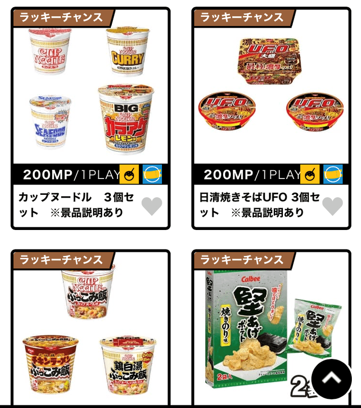 トレバでは、以前はあまり多く取り扱わなかったお菓子類やカップラーメンなどが充実してきている。景品が2個や3個セットになってる事が多い。