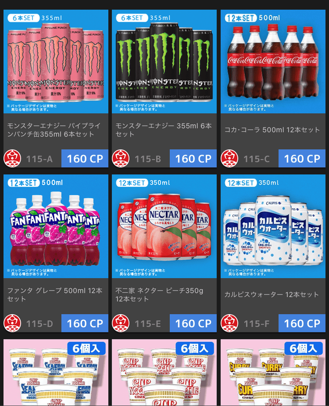 飲料系も多くコーヒー・紅茶・炭酸飲料・スポーツドリンクなど様々揃っており、飲料系の場合は大体ケース単位で景品になっている事が多いです。食品系だとカレー・パスタ・牛丼などのレトルト系の商品、インスタントラーメン、カップラーメンといった物が多いです。基本的にはスーパーやコンビニで売っている商品と同じものがオンクレでゲット出来ます。