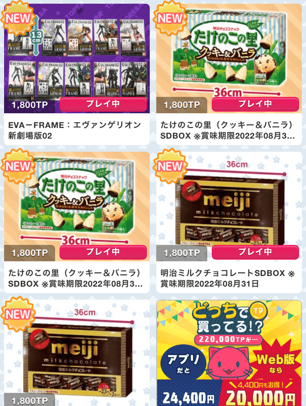 クレプラには、お菓子・駄菓子類が充実しています。運営会社はクレーンゲーム鑑定団と同じなので実績があります。